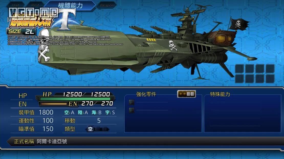 《机战T》本次的战舰担当,就是《无限轨道SSX》,继承了《机战V》的《宇宙战舰大和号》和《机战X》的《蓝宝石之谜》。阿尔卡迪亚号与前两作的大和号和新鹦鹉螺号一样,可谓是整部作品最强的战舰,力大皮厚,如果增加战舰的移动力的话,几乎可以放到地图正中央吸引火力,并稳定输出。