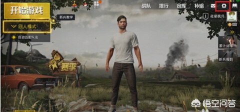 第一步在我们的手机里面打开和平精英,进去主界面之后,点击右上方的设置图标,如下图所示: