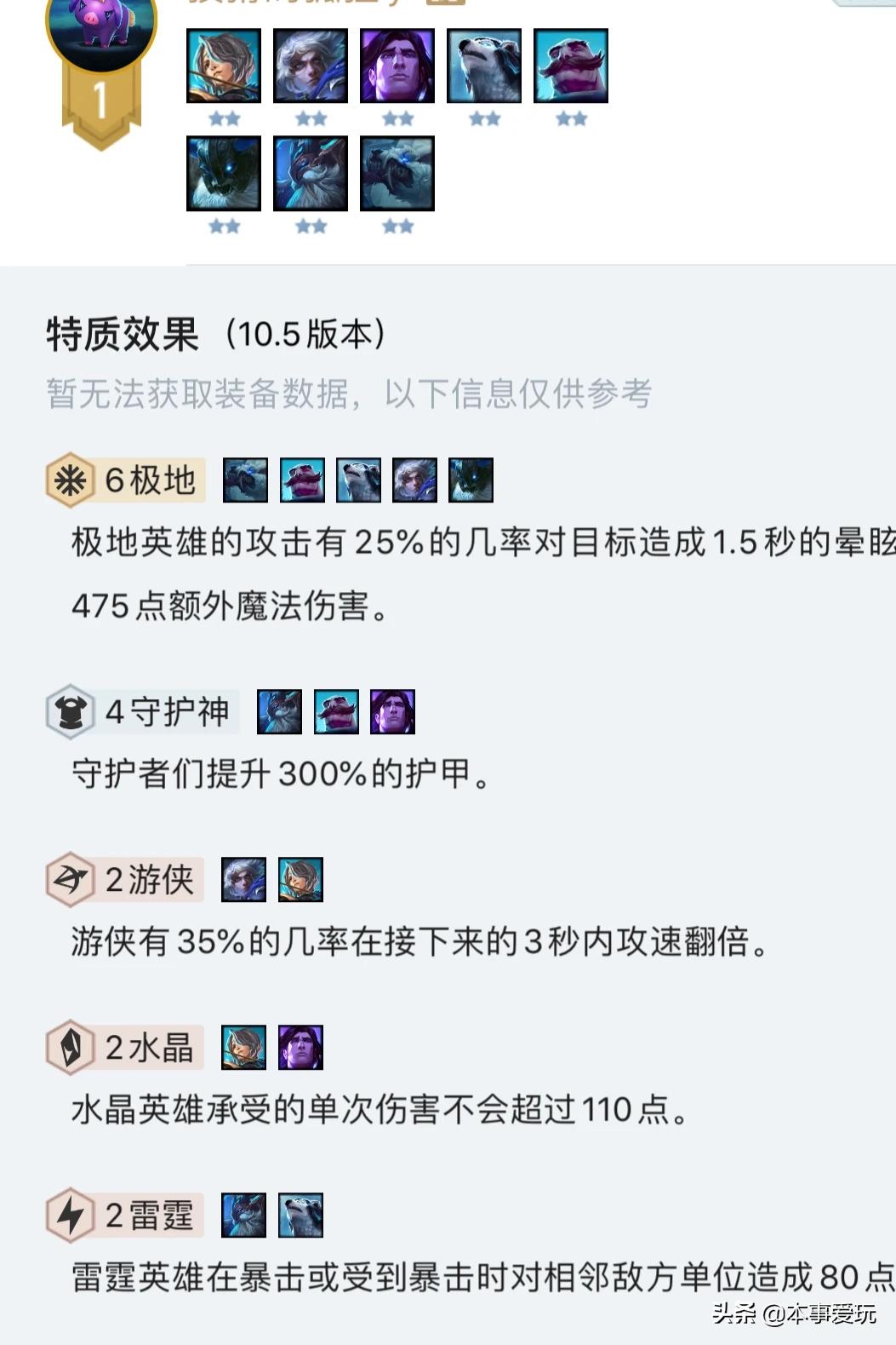 我最近也在玩云顶吃点分可是特别难啊,各种法海,影,雷影召,到了后期真是一点都打不过啊。这里呢本事推荐大家玩一下6极地,首先哈要有金铲子和巨人腰带搞个极地出来,没有的话后期搜大元素使也是差不多的。