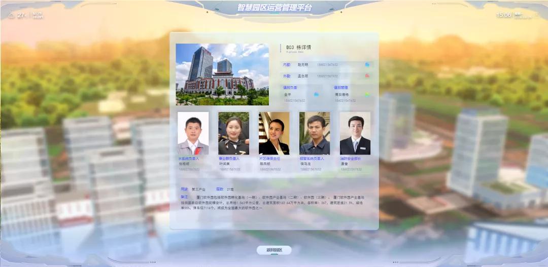 创建园区物业内部管控模块,整合物业人员数据信息,可满足轻松应对日常执勤的管理要求。双击楼栋序号即可浮现对应楼宇的运维详情、值班信息、负责人资料,可自定义值班人员信息,为管理者进行人员调度指挥提供信息支撑。在健全企业服务意识的同时,也提高了跨部门跨层级沟通的效率,让全体职员都能通过网络实现协同工作和产业管理。