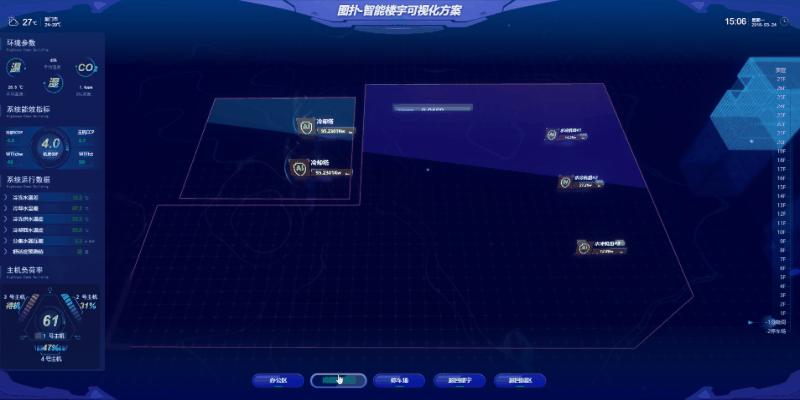 通过 HT 引擎强大的渲染功能,真实还原冷却塔、冷水泵、冷水机组、冷凝泵设备的运作效果,选用不同颜色对各管线运作内容进行区分。可实时显示冷源设备的转速、AI 预测值、平均速率、负载流速等设备的动态数据,同步采集环境参数(温湿度)、系统能效指标(机房 COP)、系统运行数据(冷冻水温差、分级水器压差等)以及主机负荷等多重指标于 2D 面板中,创建多参数实时监测。