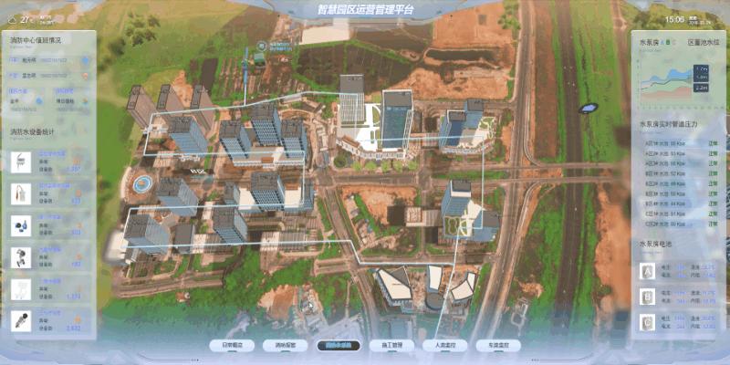HT 场景针对铺设的市政消防给水管网路径做了高亮处理。融合智能感知设备数据,赋能其对建筑物中消防水的监视及控制调节作用,再结合 2D 面板将园区内重点监测的消防水压、液位、温湿度、流量等关键设备参数集中显示,可完全替代人工巡检。保证始终处于持续稳定的预定压力状态和有充足的水量,在火灾发生时能快速出水。
