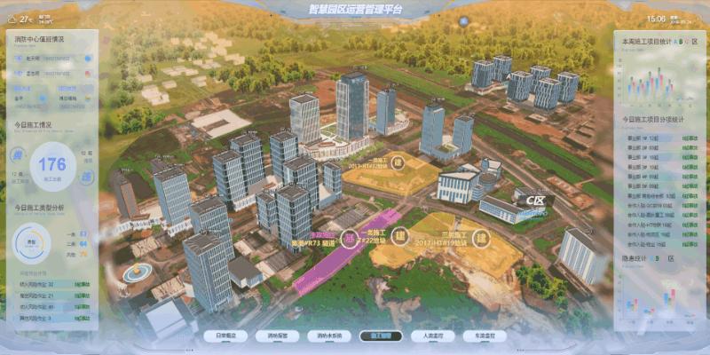 园区的施工建设与招商进度、企业入驻情况息息相关。有效整合现有资源,通过不同颜色色块对工程项目进行区域划分,合理确定地块开发强度和用地规模。围绕建筑工程项目全生命周期,建立支撑现场管理、数据共享、互联协同的信息化平台,重点关注工期进度、类型分析、项目分项、隐患统计等关键性指标,牢牢把握施工现场“人、机、料、法、环” 五要素。