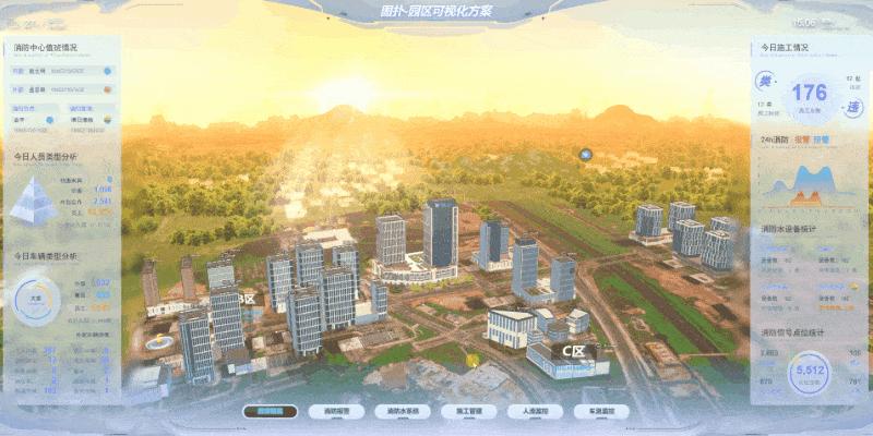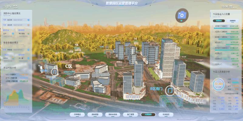 首页面板信息集合了园区内各项监控信息概要,以三维场景为依托,应用虚拟仿真技术对园区建筑、设施、管线、园林进行全方位复现,初始化后的场景可对园区全景漫游,结合 HT 引擎强大的渲染能力,保证场景在 Web 中高效流畅地加载运行和场景优秀的可视化效果,仿佛置身于真实园区环境中。