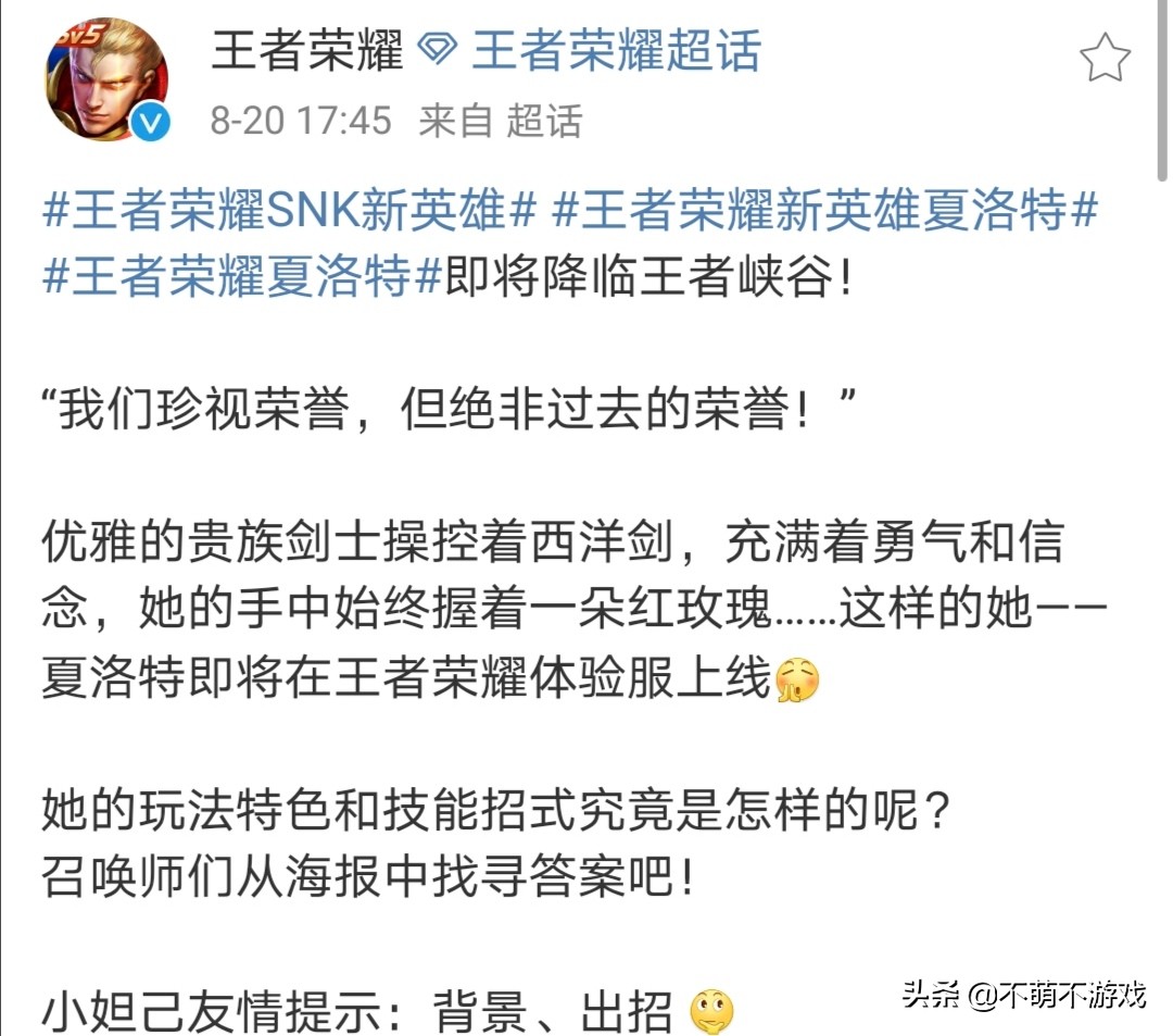 大家好,我是指尖王者之风。英雄上线其实早有征兆,因为早在七月份的时候官方微博就预示有一位侍魂剑客在王者荣耀登场。最近这位新SNK英雄下周就上线了,而对于新英雄夏洛特的到来,想必大家也是心情复杂,既希望这位英雄可玩性高,又担心英雄游戏平衡,ban位又怕要多位常客。