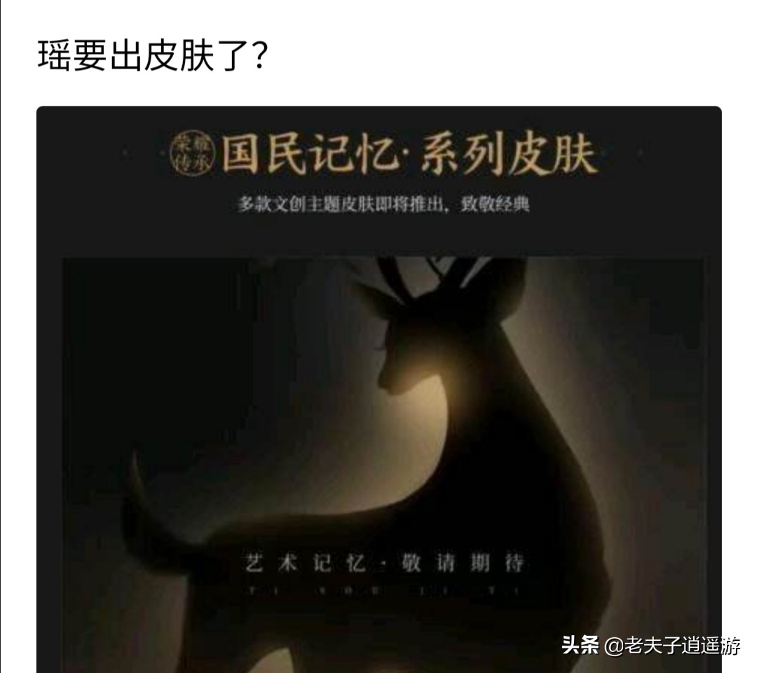 同时最近有爆出一张图就是国名记忆系列皮肤,说明有多款皮肤即将推出,其中有一张鹿的暗影,大部分玩家由此猜测第一款这种系列皮肤应该是给到了瑶,因为瑶是鹿灵,这跟她的身份很符合,不知道大部分玩家你们的意思是什么呢