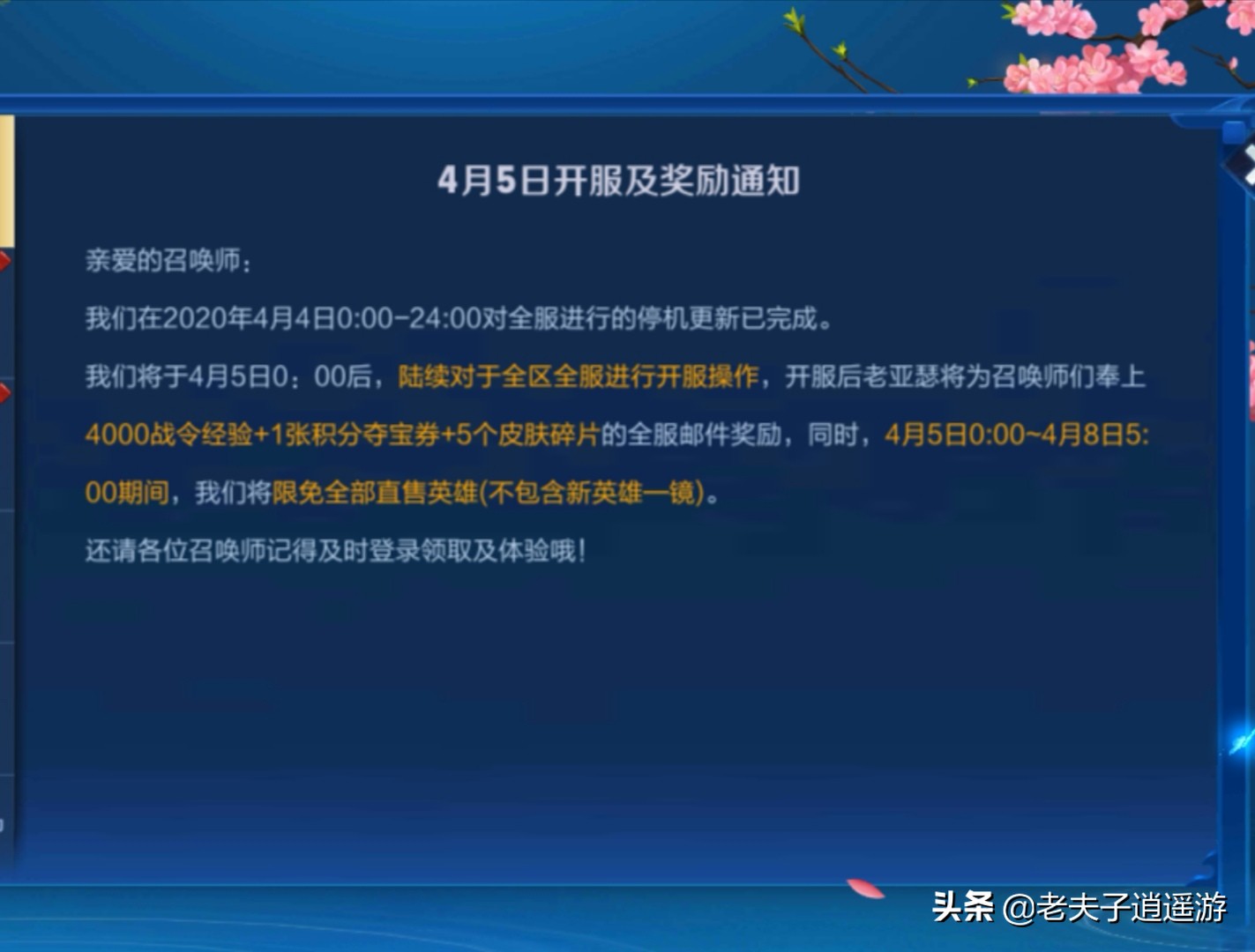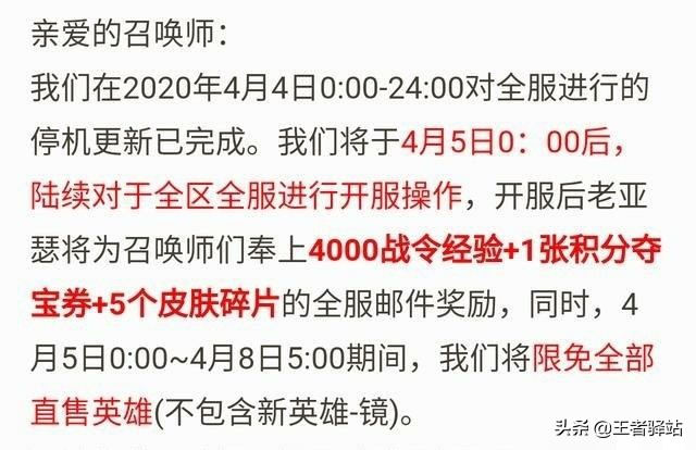 不错就是补偿玩家四千战令经验跟一张积分夺宝券和五个皮肤碎片,同时从今天开始有为期三天的限免全部值售英雄可以使用,除了新英雄以外。