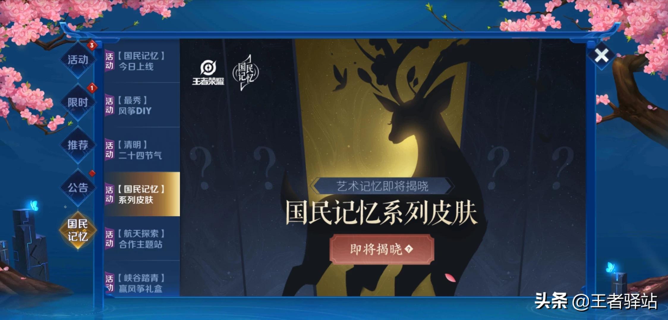 在王者荣耀活动面板上官方开放了国民记忆系列皮肤 可以看到内容背景是一头鹿,很容易就联想到王者荣耀中的辅助“瑶”,难道瑶妹要迎来新皮肤了?作为一名软辅,瑶的出场率一直很高。如果本赛季要迎来新皮肤的话 ,势必瑶会再一次迎来热度高潮,到时候辅助强度梯度或将迎来变化。