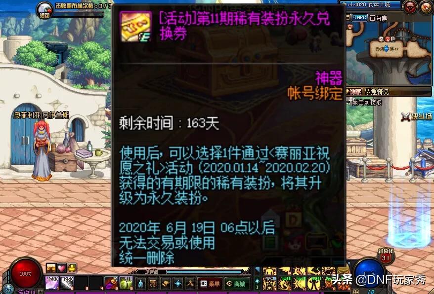 DNF1.14春节版本,玩家登陆游戏,就可以找赛丽亚领取一套“天11稀有天空”,然后使用的期限是100天,全民只要在活动期间登录游戏,就可以获取天空。