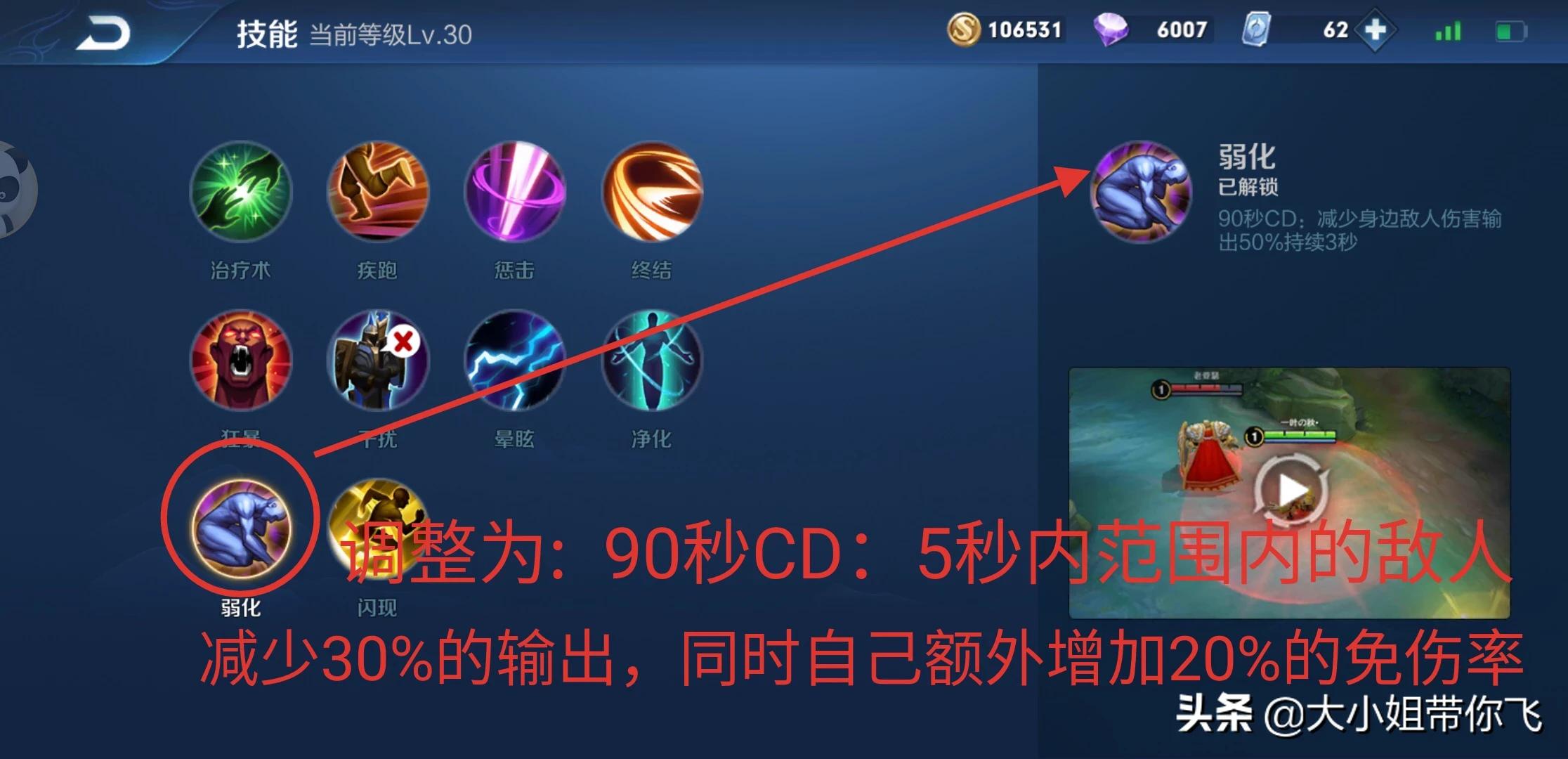 最后就是弱化这个召唤师技能了,弱化一般是辅助比较经常携带的技能,关键时候把该技能给到敌方核心输出身上还是很有效果的,在这次的改动中,也是有我们想象不到的地方,90秒CD:减少身边敌人伤害输出50%,持续3秒,改动为90秒CD:5秒内范围内的敌人减少30%的输出,同时自己额外增加20%的免伤率,总的来看,虽然说是在一定程度上减少的对敌方英雄输出的弱化,但是我们同样能看到它增加自身20%的免伤率,那么效果就出来了,不仅可以防止敌方一人的输出伤害,同时其他四人的伤害也同时减少了,算起来还是比较划算的,那么这样看起来,边路的坦克型英雄估计会爱上这个召唤师技能了。
