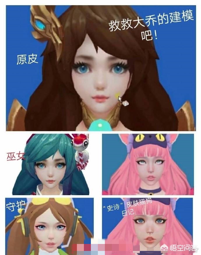 我们再来看看守护之力,酱色的头发和头饰,已经被建模师打入了凡间,看起来是那么的土,眼睛拉长了一些,但是显的空洞无神,甚至还有了斗鸡眼的感觉,再看看那张嘴,已经张开了很多,总体上看,变得呆板了很多,而到了猫狗日记皮肤的时候,大乔已经完全变了模样,脸型变得细长,眼睛已经看不到瞳孔,甚至还出现了翻白眼的情况,嘴巴就像打了过多的玻尿酸,配上粉色的头发,就是一个非主流丑女。