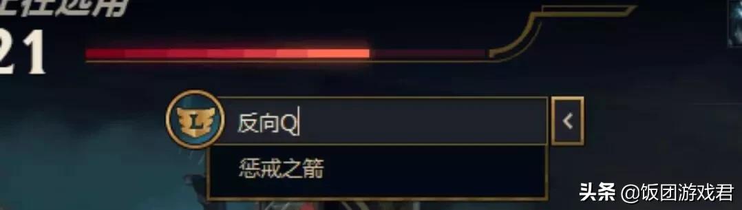 当我们在搜索栏输入反向q的时候,出来的英雄是惩戒之箭韦鲁斯,这个梗来自于现在的绝地求生选手韦神,在2015年全球总决赛的一场比赛当中,韦神使用韦鲁斯,在最后一波团战,对面的残血布隆准备逃生,韦神的Q捏在手上,只要打中就收下这颗人头,可不知道为什么,这发q却被射反了,于是就有了反向q这个梗。