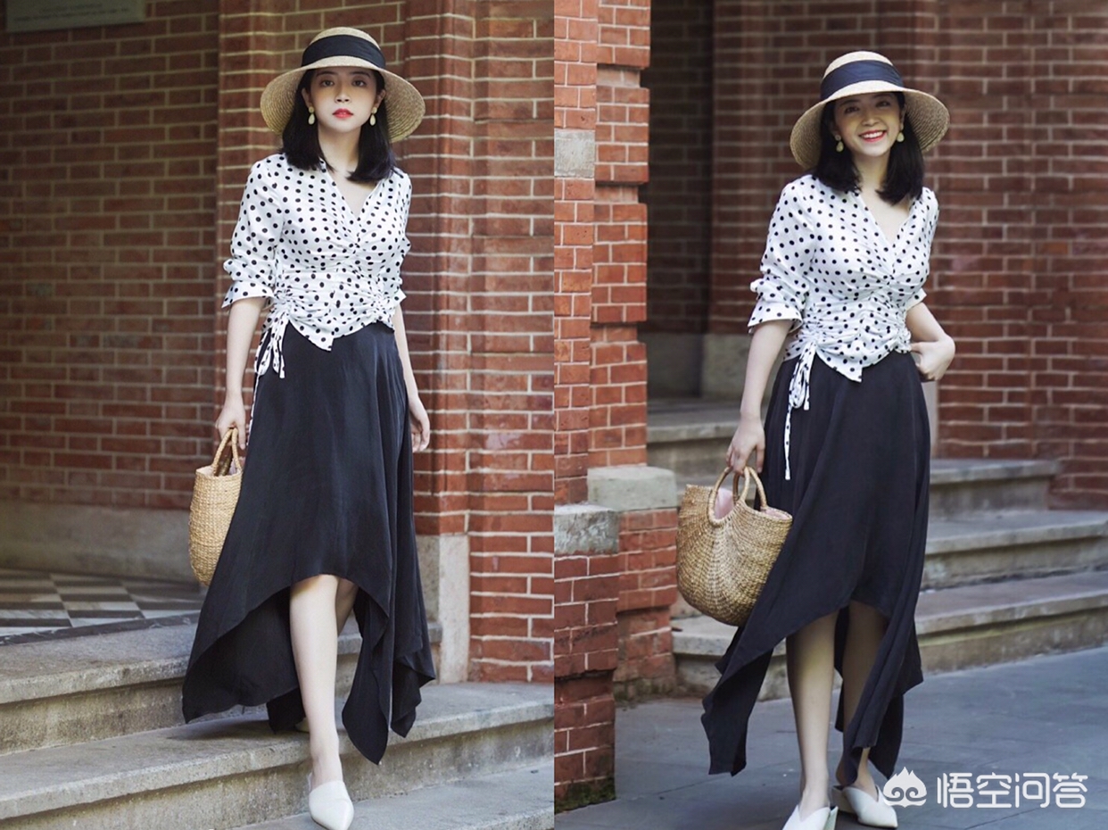 ▲波点元素的半身裙复古又时尚,白色背心搭配黑底白波点半身裙,上衣故意把一边叠起收进裙子里,打造不规则的款式,层次感分明,腰间的腰带起到显瘦显高的重要作用,很适合梨型身材的小姐姐,能完美的修饰身材缺点。再配上一双白色尖头高跟鞋,优雅知性又不失高贵气质,通勤日常都很适合。