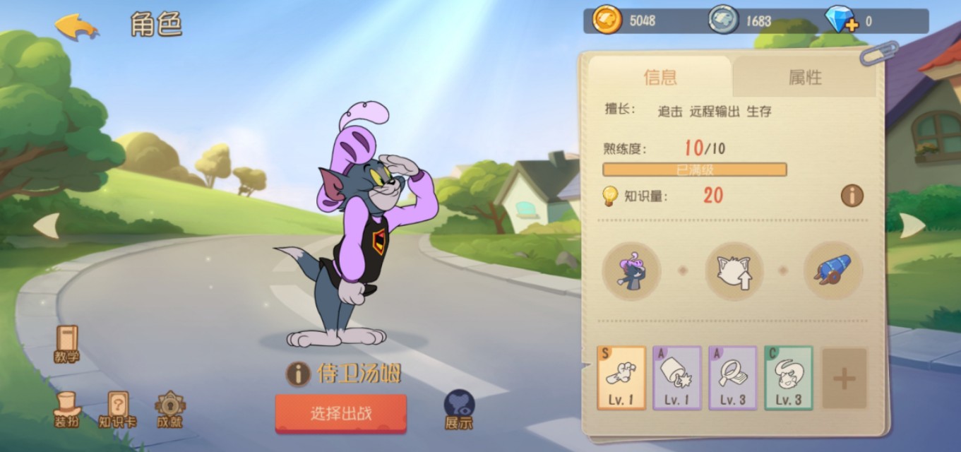 汤姆的血厚,并且使用攻击的间隔非常短,让我们能够更频繁的去攻击老鼠,同时优秀的血量也不容易被老鼠群殴。再者汤姆的武器技能手型枪是一个不容易让老鼠逃脱的技能,带上一张铁手知识卡,基本上老鼠到手里跑不掉。
