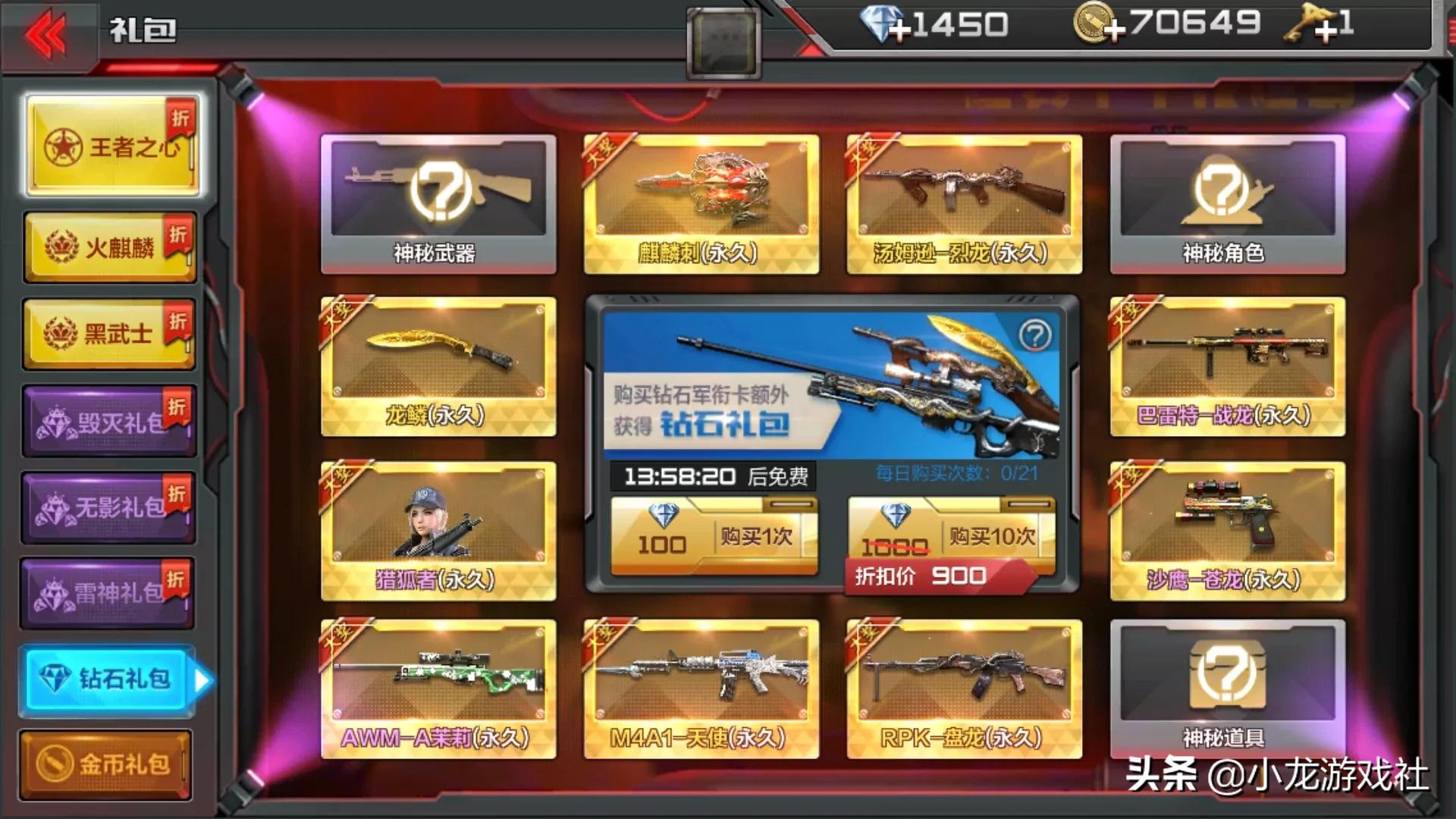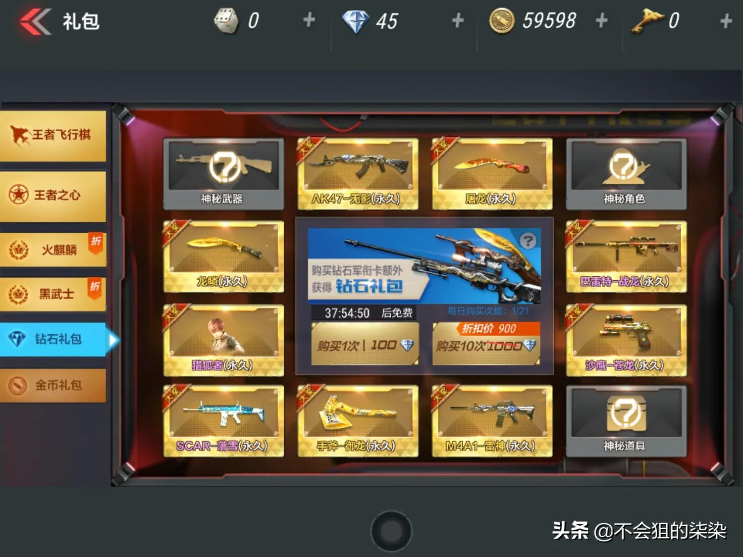 天美为了让我们人坑钻石礼包玩法升级,从一开始的隔三差五更新出钻石礼包全永久玩法。吸引了一大波玩家人坑,其实中奖概率还是没变(抽中的永远不是英雄级武器你们懂我都意思吧。)到现在的天天全永久,天美为了让我们套我们手中的钻石也是煞费苦心,钻石礼包更新出十分诱惑的英雄级武器。前前后后往钻石礼包里面砸了那么多钻石,可还是没有出英雄级武器。