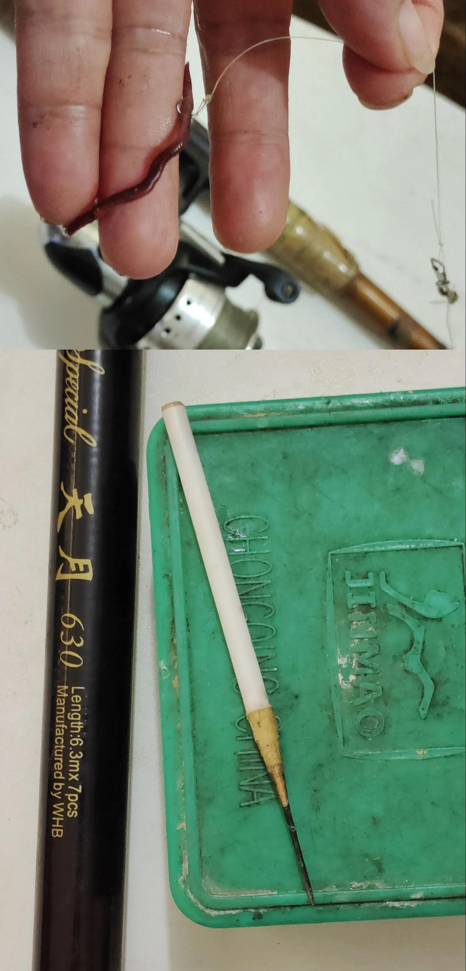 到了中午,很多钓点都很少上鱼了,工友们有的吃中午,有的抽烟喝水,看着他们鱼护里游来游去的鱼,再看看自己少得可怜的尾数我很沮丧。不经意回头望了一下篮子,一截有导线环的细竿露了出来,是支2.4米的海竿。有了,可用海竿一试。灵感来了,我手忙脚乱的开好海竿,挂上蚯蚓抛出到5米处铅坠落下,刚收紧线竿尖就频频点头,我心中狂喜奋力扬竿中鱼,那一瞬间我太高兴啦,边收线边猜是什么鱼。到了面前一看是条4指罗非鱼。找到了方向我连午饭都不想吃了,抓紧时间钓个惊喜和兴奋吧。就这样反复抛竿收竿捞鱼,尾数也增加到了25尾。