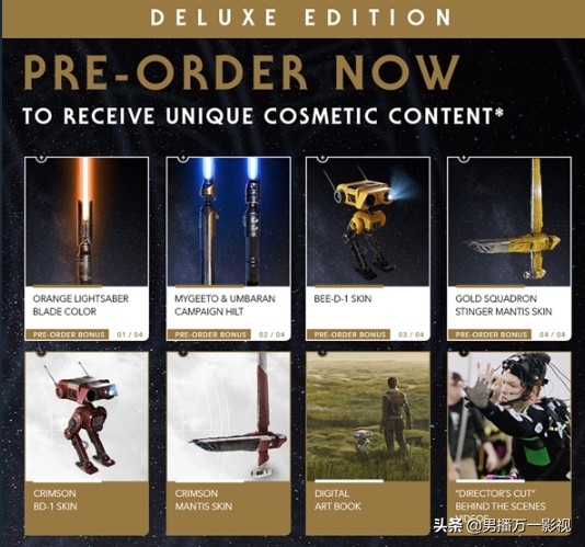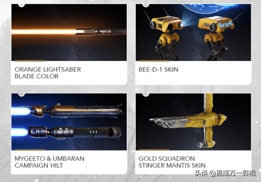 购买标准版可以获得预购奖励橙黄色光剑、BEE-D-1机器人皮肤,麦基托·昂巴拉的光剑、金黄中队飞船皮肤,此外没有其他内容。