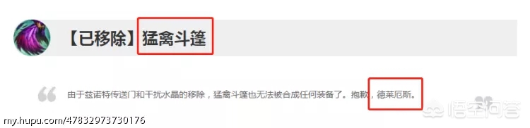 在季前赛更新之后增加了很多的装备,同时也是有一大批的装备被移除了,其中对诺手比较关键的就是这个猛禽斗篷了。这个斗篷被移除的说明当中还有一句调侃“抱歉,德莱厄斯”的确,这件装备几乎只有诺手一个人在出,被移除也正常。