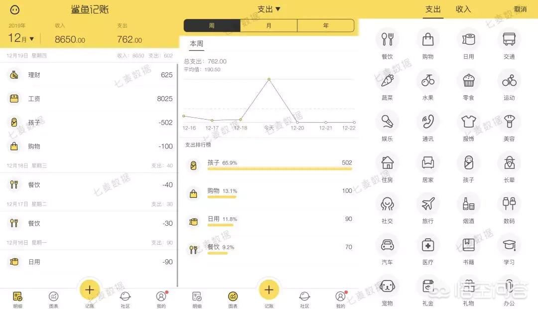 如下载量排第一的「鲨鱼记账」,根据收入和支出的不同情况,设置了十分详细的分类。而用户只需选择分类将每日的收入和支出记录在产品当中,产品就会自动形成一个流程单,同时以表格的形式展示用户的财务情况,以及按照数额进行排名,能让用户很直观的看到自己的消费情况。