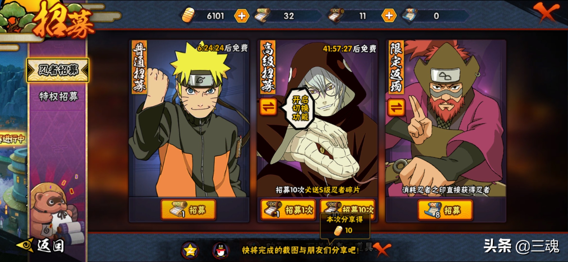 一,火影手游,现有120招募券,无月卡无组织,大概多久出纲手?