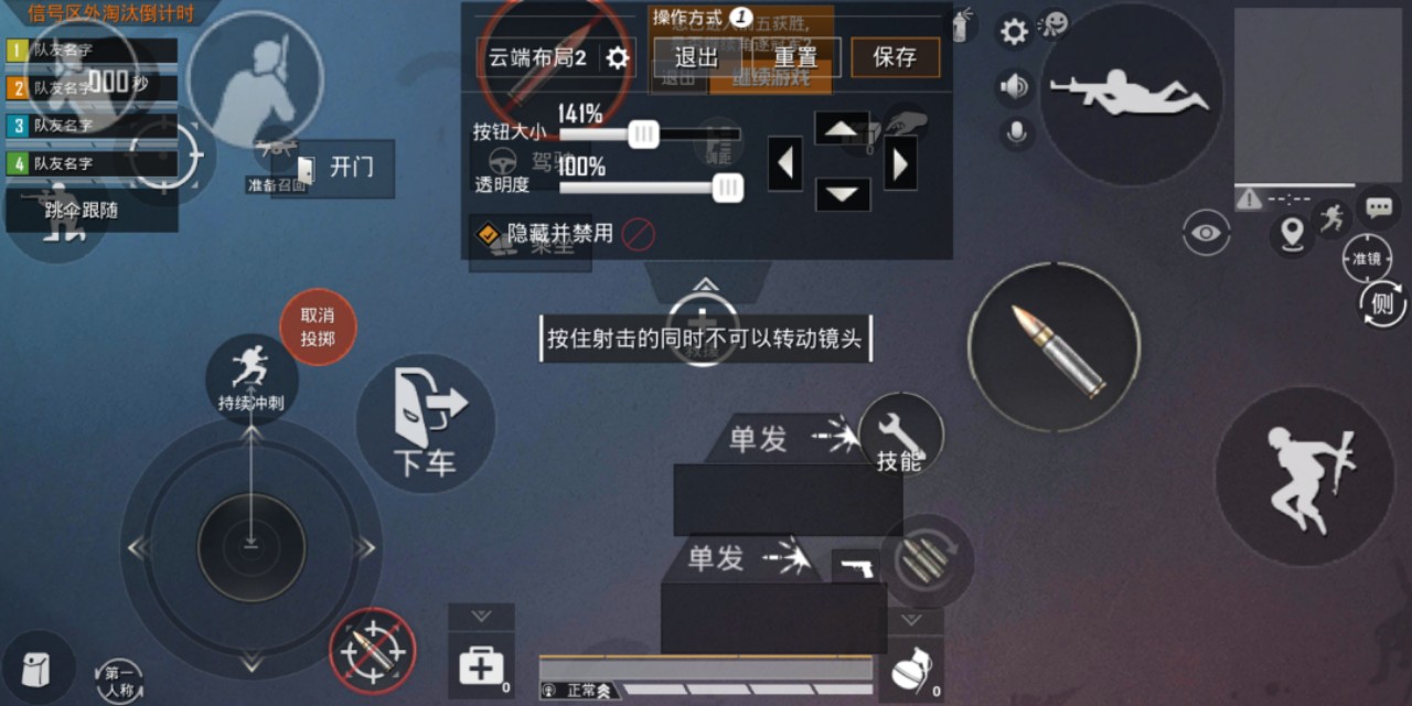 第三点键位自定义设置。玩家可以按照自己的习惯,自定义游戏按键位置。像常见的三指,四指,五指玩家。都是通过自定义按键位置达到一个优化操作的目的。实现很多二指达不到的操作方式。这里我分享一下,我是四指操作的一个键位设置。