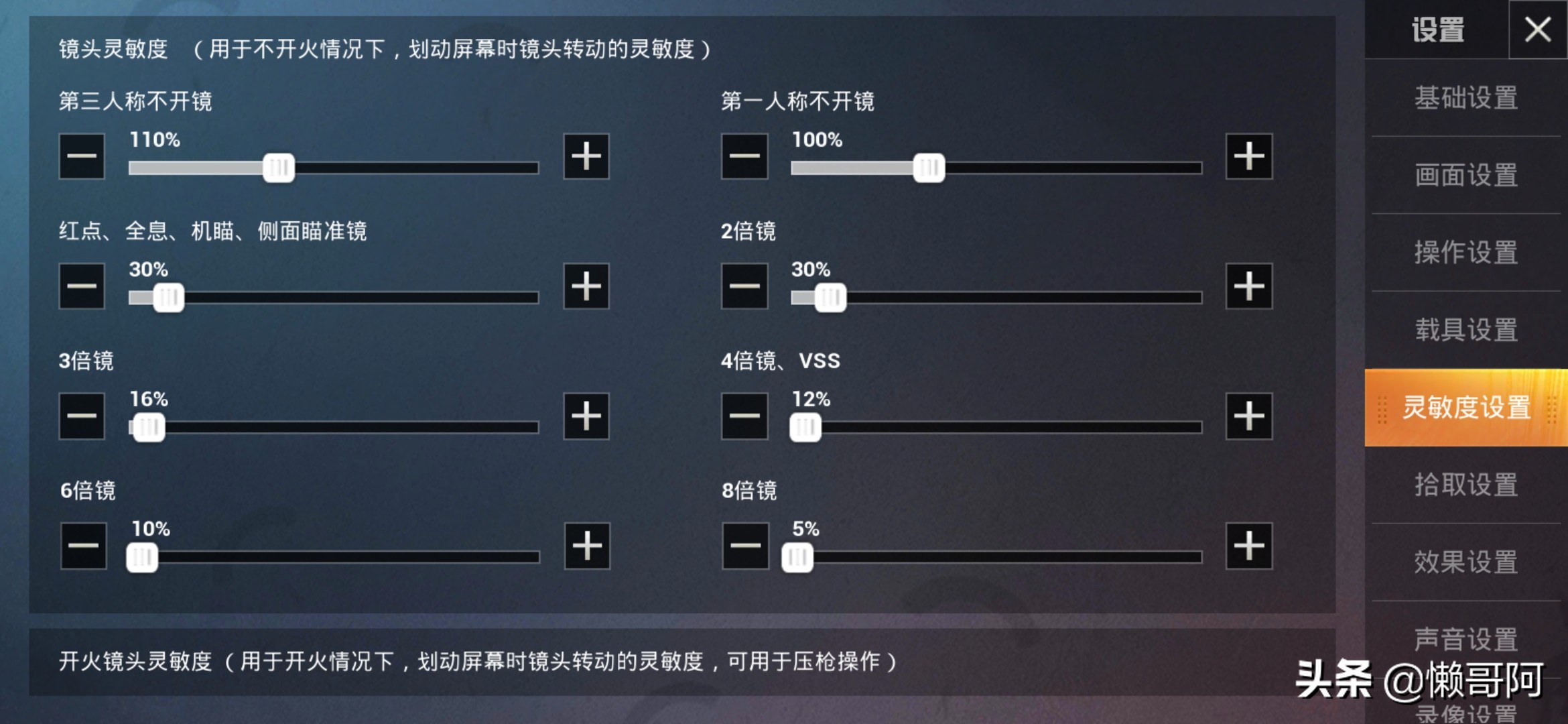 第一点灵敏度的设置:一个好的灵敏度。能够让压枪变得更简单。我最主要是用陀螺仪压枪的。现在的智能手机都有重力感应功能。只要通过调整手机姿态来转动镜头,就可以实现压枪。不需要手在屏幕上拖动开火键,我觉得陀螺仪是一个非常好用的压枪设置。以下是我的陀螺仪灵敏度。