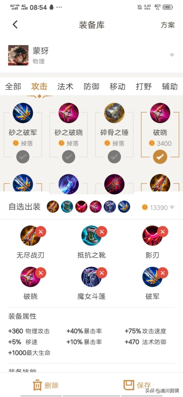 1,出装建议:冷静之靴+暗影战斧+无尽战刃+影刃+破军+贤者的庇护。