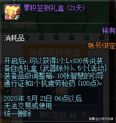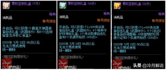 累计奖励中7天的奖励是最高天武器和5个盒子,这个奖励有点奇葩,只给了盒子没有锤子,这是诱惑我们花钱买锤子啊,7天的奖励可以忽略了,14天的奖励是一个100级传说自选礼盒,没有武器,以及4个稀有守护珠盒子,和一个传说勋章,最后是一个100点的疲劳药,这个奖励中只有传说装备和疲劳药还是不错的,21天的奖励是100级传说装备自选和5个装备调整箱10个深渊通行证以及100点疲劳,这次主要是以疲劳药和深渊票为主的,总体还算可以吧,大家认为呢。