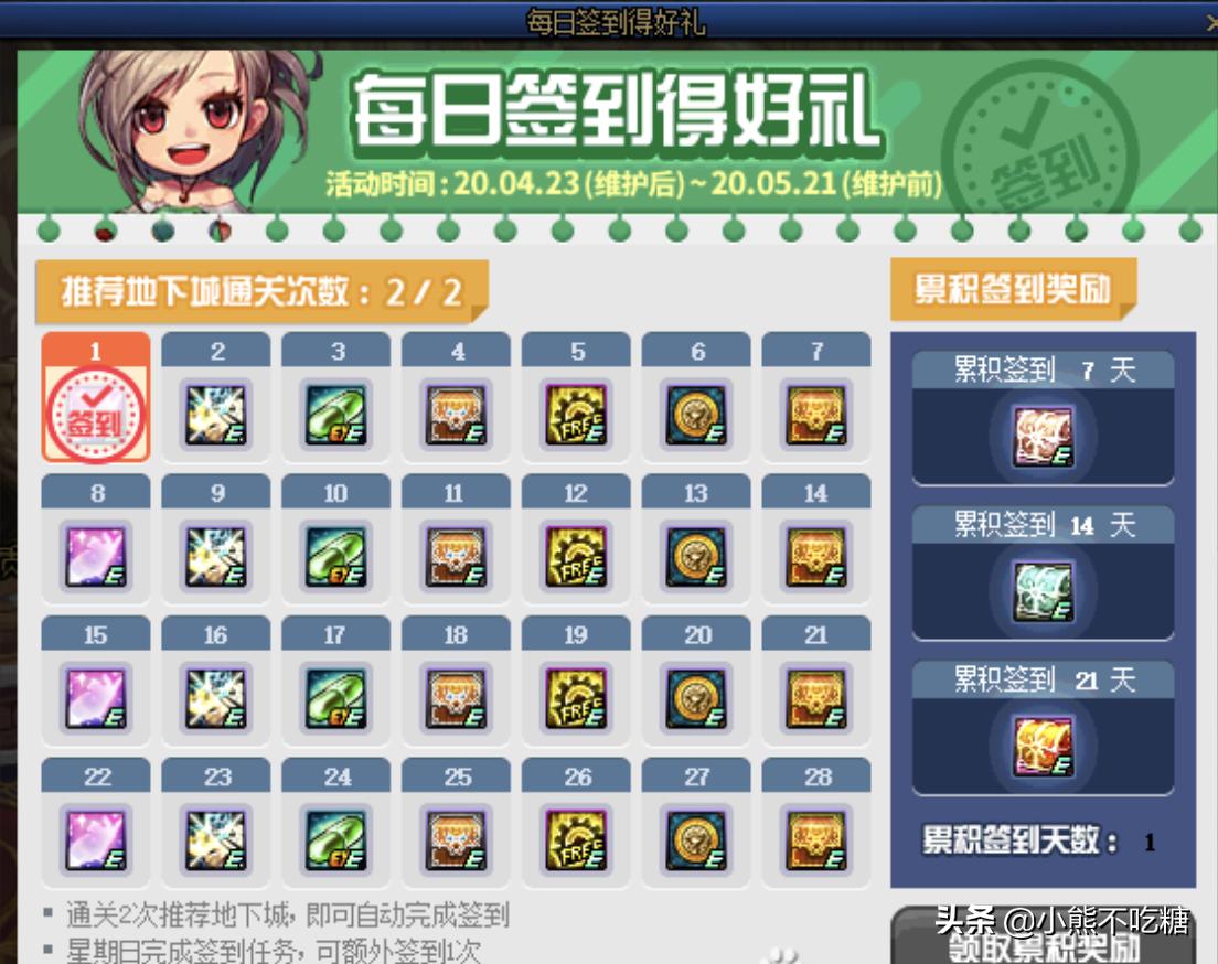 活动时间持续28天,每日登陆游戏,刷两次推荐地图,既可以自动完成签到,然后星期天刷图,可以额外增加一次签到,活动持续28天,累计21天可拿全奖励,应该没什么难度。