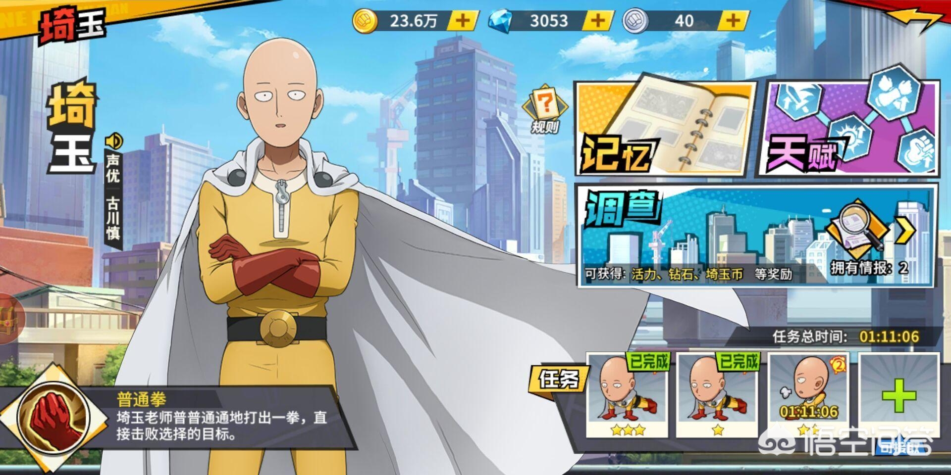 至于琦玉呢?其实,在《一拳超人》手游中,官方已经为每位玩家变相地赠送过琦玉。因为我们不管在“首领挑战”,亦或者“琦玉调查”的任务中,都能够召唤琦玉,使用“一拳通关”迅速结束任务。琦玉作为《一拳超人》动漫的最强存在,是很难被设计成游戏角色,供玩家使用的。不过,琦玉能够帮助我们通过重复的关卡,节省时间,还是相当不错的。正是“一拳通关”的游戏设定,使得琦玉的最强设定能够和游戏完美匹配。