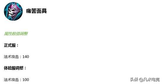 此次调整为削弱,减少了法术攻击,由140下调至100。痛苦面具基本上是法师的核心装备,无论是攻击还是穿透都是非常有利于法师的输出。此次降低40点法术攻击对于前期法师的输出而言有所限制,但是中后期的影响不大。