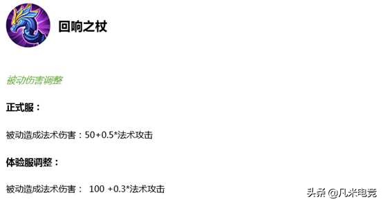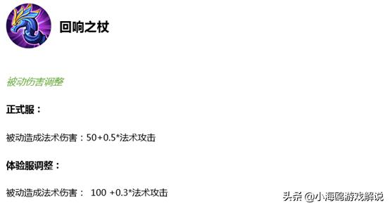 法师前期的两件神装都有所削弱,其中包括回响之杖的被动削弱了法术加成,虽然加了一点点前期伤害,但是这件装备一旦做成之后,性性价比跟之前比就有着非常明显的下降。