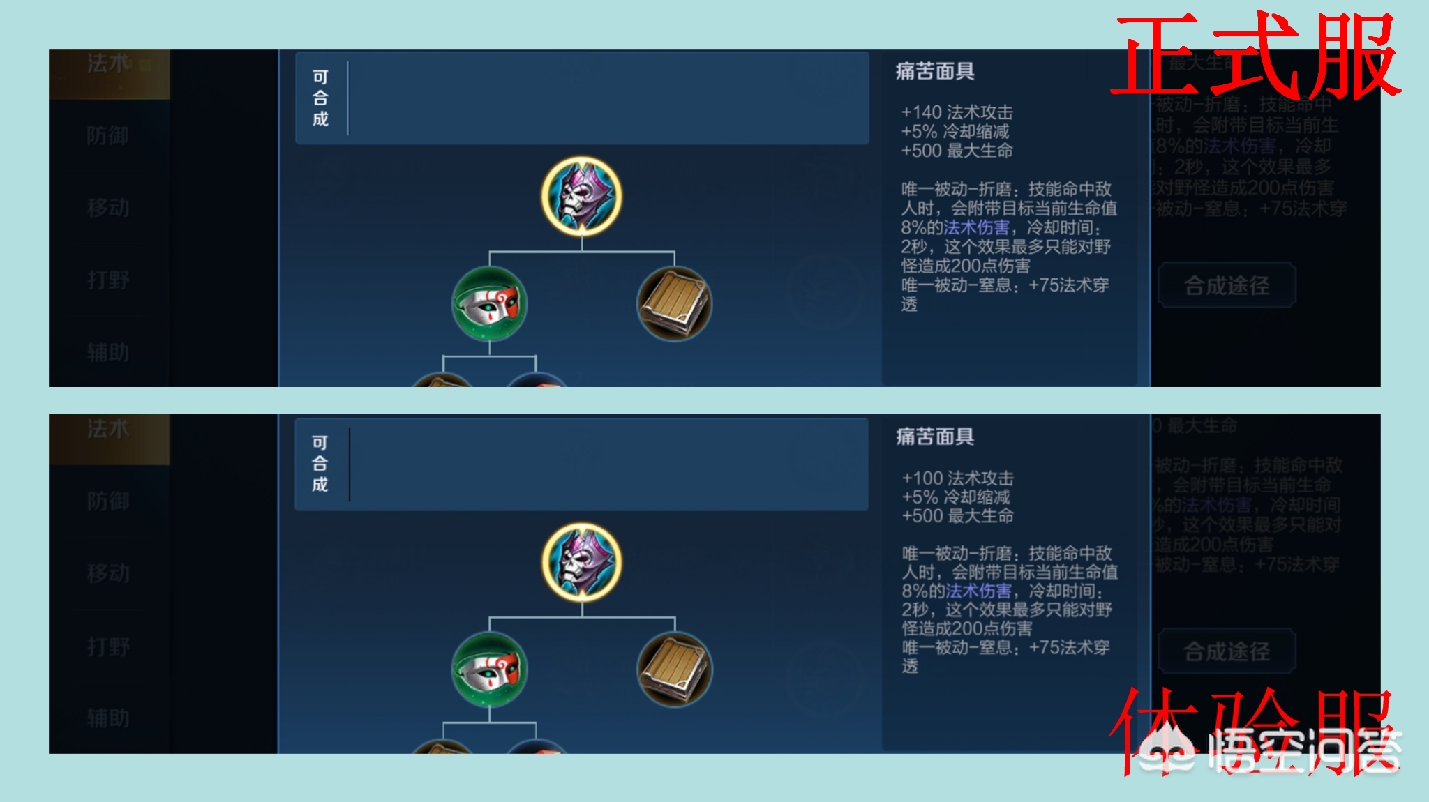 痛苦面具,法强直接降了40点,这么一改,它将完全变成了一件功能性的装备,除了被动可以增加生命百分比伤害之外,它本身的法术加强已经低到一百点,这个装备将不会是法师首选了,但是回想之杖依然是首选,毕竟7%的移速还是法师非常需要,前期的游走支援能力不至于太弱。