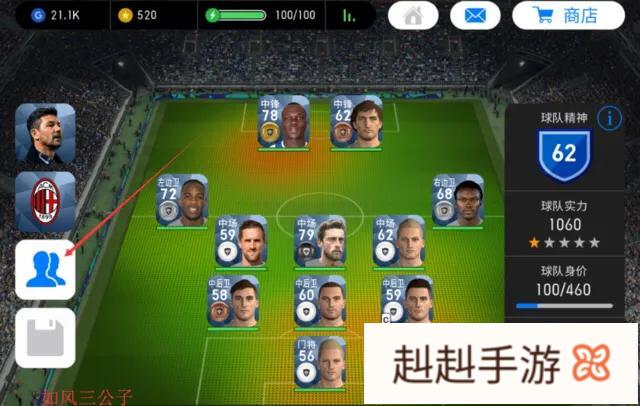 4 玩家还可以查询到替补球员的状态,首先点击下图页面左侧的图标(下图箭头所指的那个)。