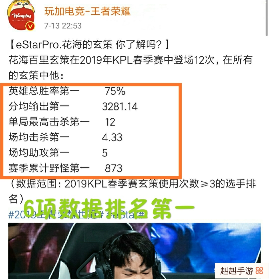 据统计eStarPro花海在百里玄策的使用上,取得了六项数据的第一名。分别是英雄总胜率、分均输出、场均击杀、单场最高击杀数、助攻以及刷野的数量上,等等方面eStarPro都是处于第一名的位置,和RNG.M在冠军杯上的第三场比赛中,花海的百里玄策足以可以证明一切,曾经花海的百里玄策也在春季赛上得到了一些教练和选手们的称赞,他们都认为花海的百里玄策就是教科书级别的演示。