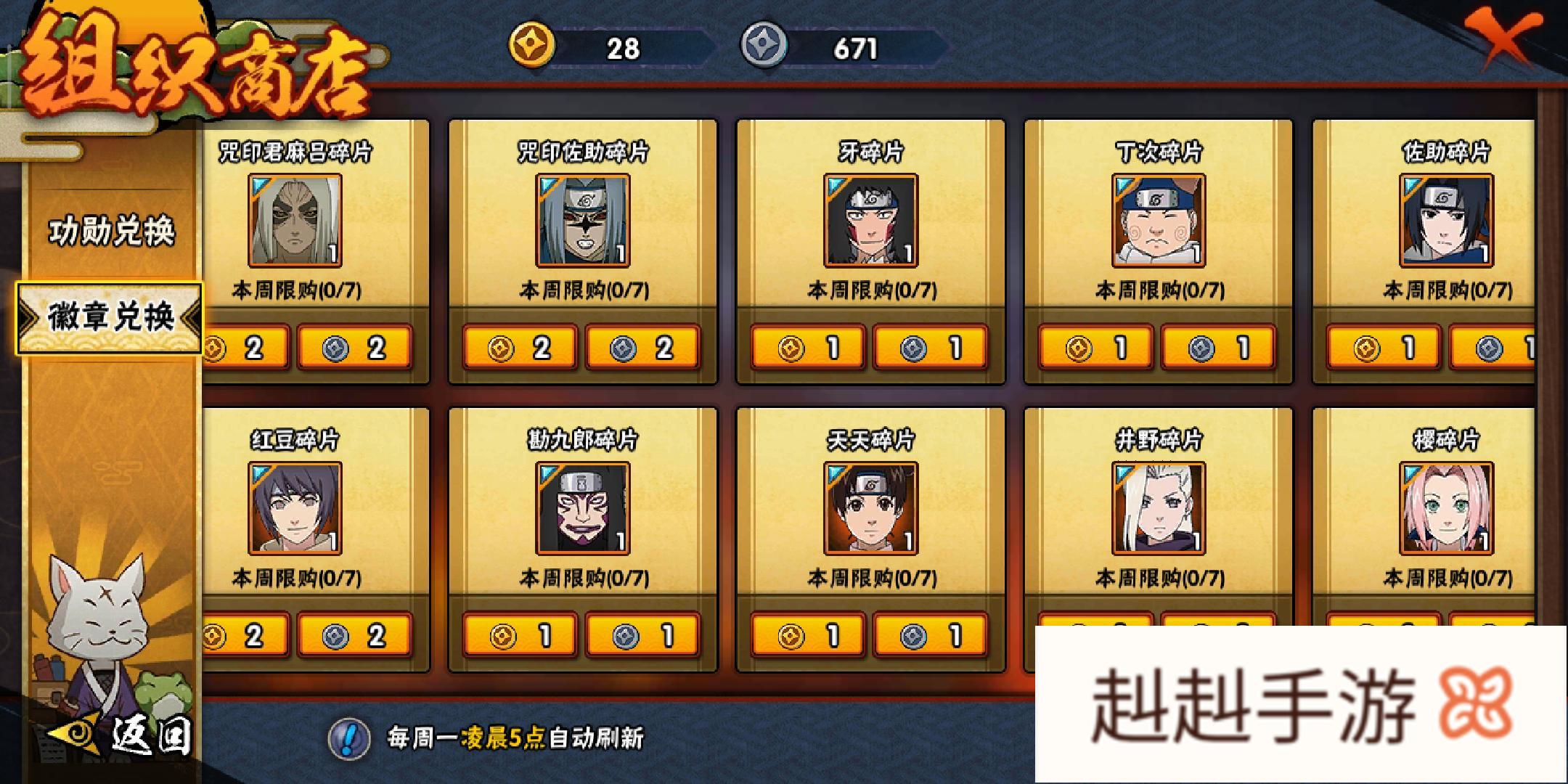 但是我个人感觉咒佐性比价也很高,如果没有这个忍者的也可以在这里换,比较靠任务随机给碎片出的几率太小了,积分商店里咒佐也要198积分一片呢,这里只有2个银徽章,我个人觉得没招募的可以换一下。