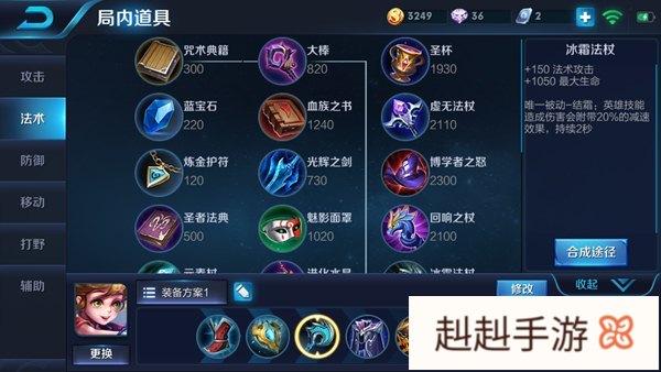 因为走的是辅助路线,所以在装备选择方面需要考虑到技能CD的减少以及控制效果的加成,推荐使用六神装:冷静之靴+极寒风暴+冰霜法杖+魔女斗篷+不祥征兆+贤者的庇护。或者是考虑下法术攻击加成的博学者之怒,辅助队友的同时提高自身的攻击力。