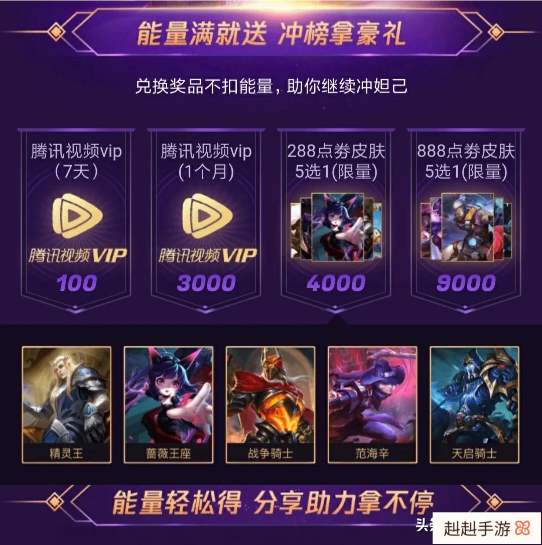 其实天美这次和微视合作主要是为了帮微视做宣传,因为现在短视频软件太多了,这个活动无论是微信区还是QQ群玩家都可以参加,活动的内容是收集能量值,达到100则可以领取腾讯VIP7天,达到3000即可领取腾讯VIP一个月,达到4000会有永久的288皮肤5选1,达到9000还可以领取888皮肤也是5选1。可以说奖励的内容是十分丰富的。