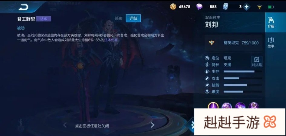 被动:君王野望当刘邦身边一定范围内有敌方英雄时,刘邦每4秒会强化一次普通攻击,造成敌方最大生命值6%-8%的法术伤害!