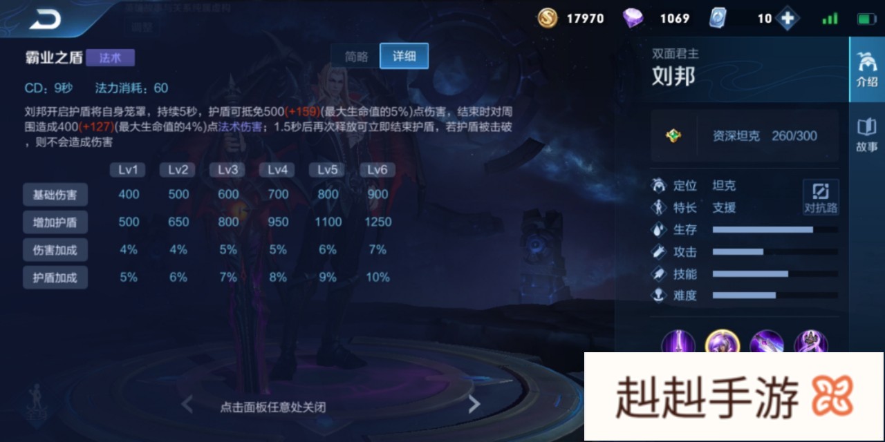 一技能:霸业之盾刘邦开启护盾笼罩自身,持续5秒,抵挡一部分伤害,并在护盾结束时对周围敌人造成伤害,1.5秒后可手动结束!