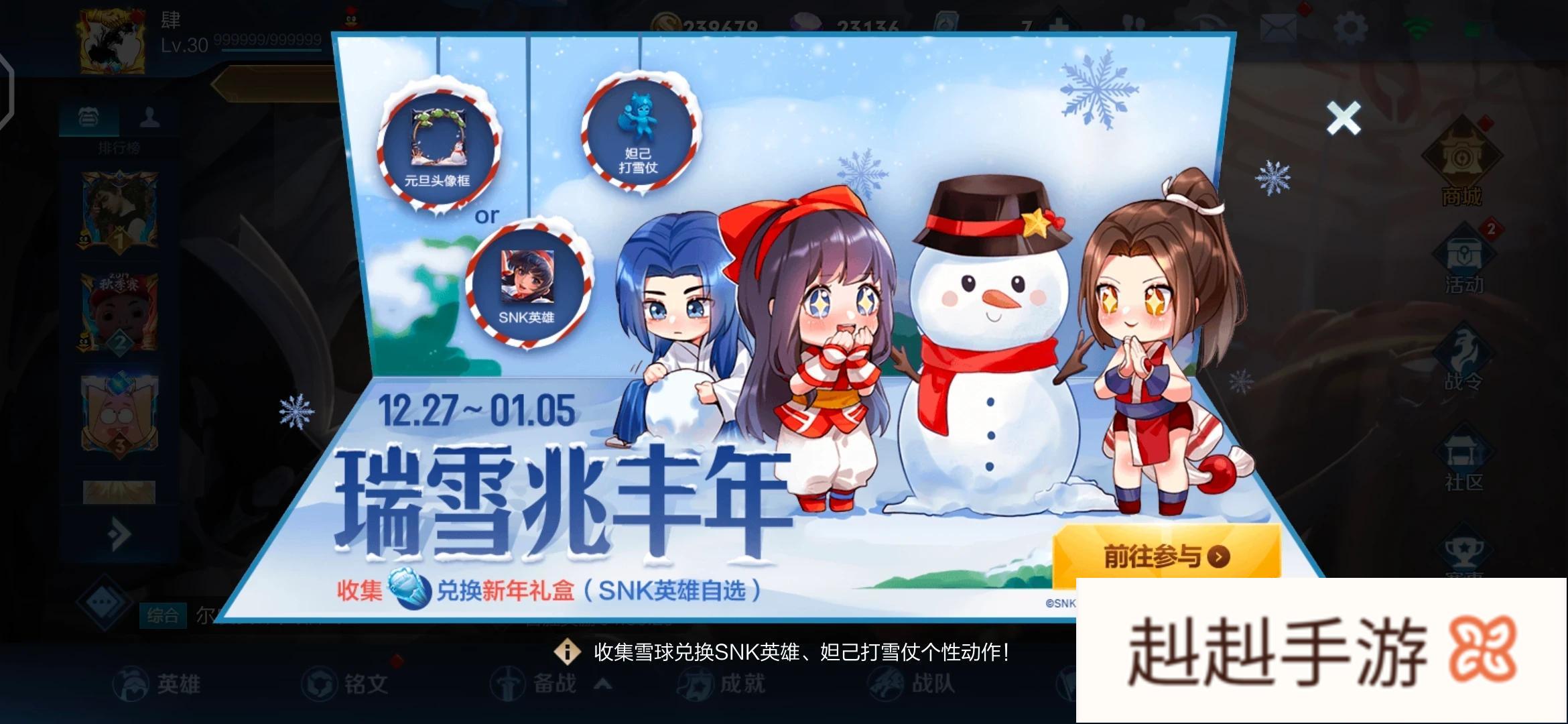当然,除了以上这些活动以外,还有其他的一些活动,也是值得大家关注的,就比如免费送的snk英雄大家不要忘了领取,具体的活动时间已经从今天开始了,将会持续到元旦期间,所以说大家不要错过了。