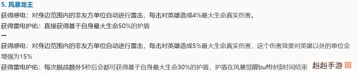 风暴龙王的击杀BUFF有所更改,感电造成的真伤增强,同时加大了对非英雄的伤害,对于开团清兵有很大效果,所以拿到龙王BUFF可能会更早结束游戏。