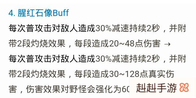 有一说一,近几个赛季红BUFF的属性真的太一般,相比于蓝BUFF,红BUFF确实只是一个高经验的中型野怪而已。所以这一次适当加强红BUFF属性,确实是很有必要的。当前红BUFF的属性是每次普攻对敌人造成30%减速持续2秒,并附带2段灼烧伤效果,每段造成20~48点伤害。改版红BUFF的属性变成每次普攻对敌人造成30%减速持续2秒,并附带2段灼烧效果,每段造成30~128点真实伤害。红BUFF的加强多多少少会使得前中期打野的伤害变高一些,gank效果高一点点。不过到了中后期可能红BUFF就更加不属于打野的,而是射手的。