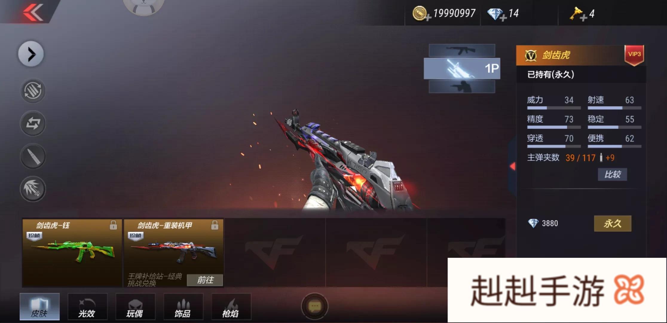 2)剑齿虎,剑齿虎是比较早期的武器了,原型是AN94,特点是威力大,弹道稳。经过这么久的版本变迁,依旧能在pvp中有一席之地。