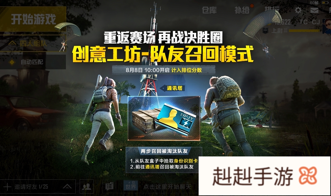 总结:以上内容就是赳赳手游提供的《和平精英》8.8更新的队友召回模式该怎么复活队友呢?有哪些值得关注的?详细介绍,大家可以参考一下。