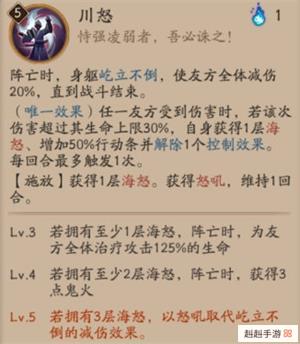 触发条件是单次行动回合中受到超过生命上限30%的伤害,因此真天与鬼切这样多段单体暴发式神一样可以触发川怒效果;川怒效果生效时会触发一次伪回合行动,本质是“SP荒川使用川怒技能解除自身控制叠1层海怒并自拉条50%”。