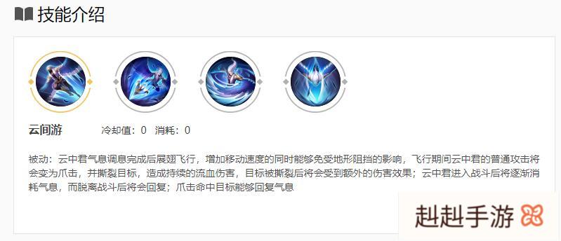 云中君的被动技能可以使他在气息调息完成后展翅飞行,如果我们选择云中君的被动技能的话,那么玩家就可以永久获得飞行能力,并且不受10年CD限制,只需要调息完成即可展翅飞行,想要落地只需要随随便便打出一拳进入战斗状态即可。