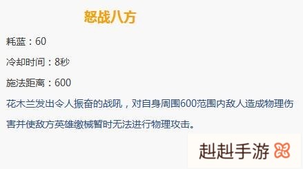 怒战八方:花木兰发出令人振奋的战吼,对自身周围600范围内敌人造成物理伤害并使敌方英雄缴械暂时无法进行物理攻击。