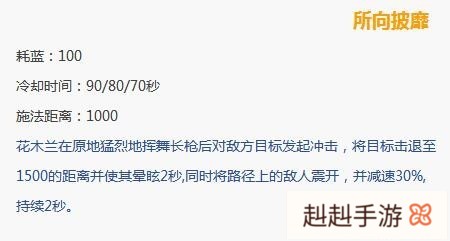 所向披靡:花木兰在原地猛烈地挥舞长枪后对敌方目标发起冲击,将目标击退至1500的距离并使其晕眩2秒,同时将路径上的敌人震开,并减速30%,持续2秒。