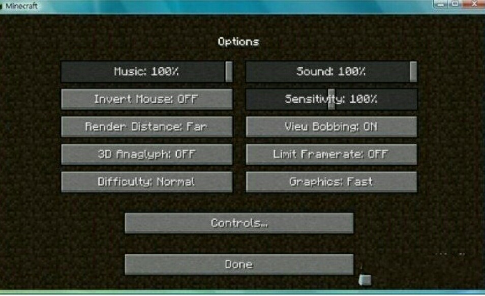 第一行:音乐键和音量键;第二行:鼠标反转,即鼠标移动和视角的关系和鼠标灵敏度;第三行:视野距离,游戏中可用F键即时调整和走动摇摆,游戏中以第一人称视角移动时屏幕模拟人真实走动的摇摆;第四行:3D立体模式和限制帧数;第五行:游戏难度,推荐使用的是Hard和画面质量;第六行:游戏控制,游戏控制子菜单翻译请看下图。